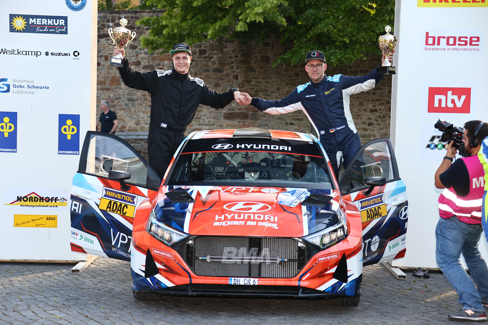 Am zweiten Tag setzten die Top 3 deren Sekundenschlacht fort. Zwischenzeitlich konnten Riedemann/Otterbach durch eine weitere Bestzeit auf der WP “Langenhorst 2” sogar die Führung übernehmen. Durch weitere top Zeiten standen sie immer wieder ganz oben auf der Rangliste. Am Ende landete das neu geformte Team mit gerade einmal 4,6 Sekunden Rückstand hinter Marijan Griebel auf einem sensationellen zweiten Platz. „Welch ein Wochenende für uns! Dass die Rallye so erfolgreich für uns laufen wird, hatte ich wirklich nicht erwartet. Für mich fühlt sich der zweite Platz wie ein Sieg an”, strahlt Riedemann im Ziel auf dem Lübbecker Marktplatz. „Nach meiner so langen Pause sind Nico und ich eine fehlerfreie Rallye gefahren. Der neue Hyundai i20N Rally2 war perfekt vorbereitet, wodurch ich mich auf Anhieb wohlgefühlt habe und mein Team rund um BMA hat einen top Job gemacht. Auch mein neuer Beifahrer Nico Otterbach hat über das gesamte Wochenende eine klasse Leistung gezeigt. Egal ob bei der Vorbereitung, dem Recce oder auf der Strecke. Man hat von Anfang an gemerkt, dass er aus einem Umfeld kommt, was sehr professionell im Rallyesport unterwegs ist”, so Riedemann abschließend. Auch bei Nico Otterbach konnte man im Ziel in ein sichtlich zufriedenes Gesicht blicken: „Die Arbeit mit Christian hat sehr viel Spaß gemacht und wir haben uns sofort super verstanden. Dass wir das Wochenende mit dem zweiten Platz erfolgreich abschließen konnten, freut mich natürlich umso mehr!”