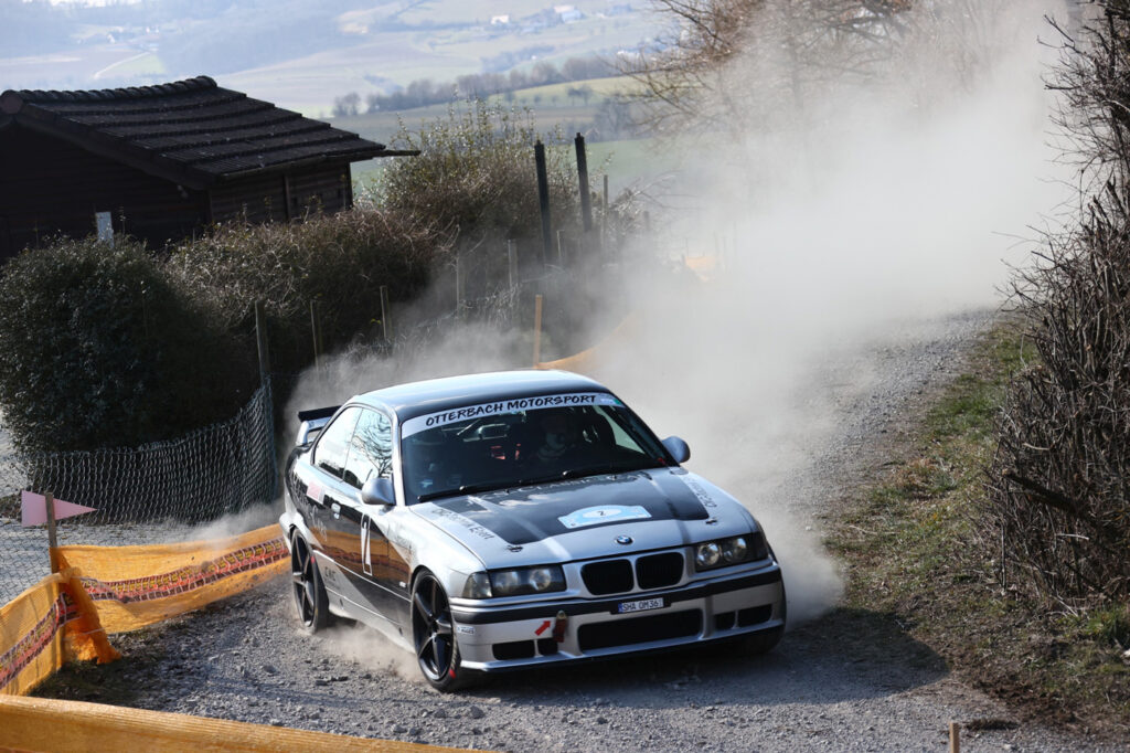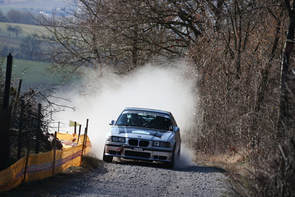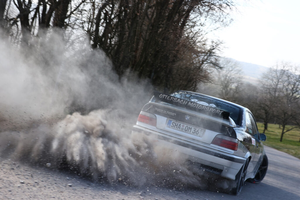 Zwei lange und anspruchsvolle Wertungsprüfungen, die doppelt befahren werden, stehen auf dem Programm der diesjährigen Rallye rund um Öhringen. Kai Otterbach fährt den M3 mit dem bekannten Reifenmaterial der Marke Hoosier routiniert zum Gesamtsieg, indem er alle Wertungsprüfungen gewinnt. „Auf der ersten Wertungsprüfung war der Luftdruck in den Reifen noch zu hoch, was zu einem spaßigen Heck geführt hat“ beschreibt Kai seine Drifts im Auftakt (Inboard siehe unten).